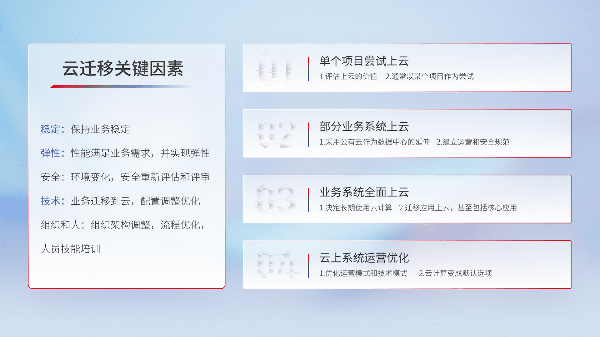 结合实际业务,,,,从规划设计、、、、云平台选型、、云原生改造、、数据迁移、、、集成交付,,,,迁移全过程为客户识别最佳上云路径,,,,做好风险识别管理,,,,设计网络架构、、、身份权限、、、、安全审计合规、、操作审计、、日志审计、、、监控告警策略、、多站点容灾设计等,,,对云上基础设施进行整体规划,,,,提升IT治理水平,,,,以满足弹性、、、、高可用、、、、高性能的需求。。。。