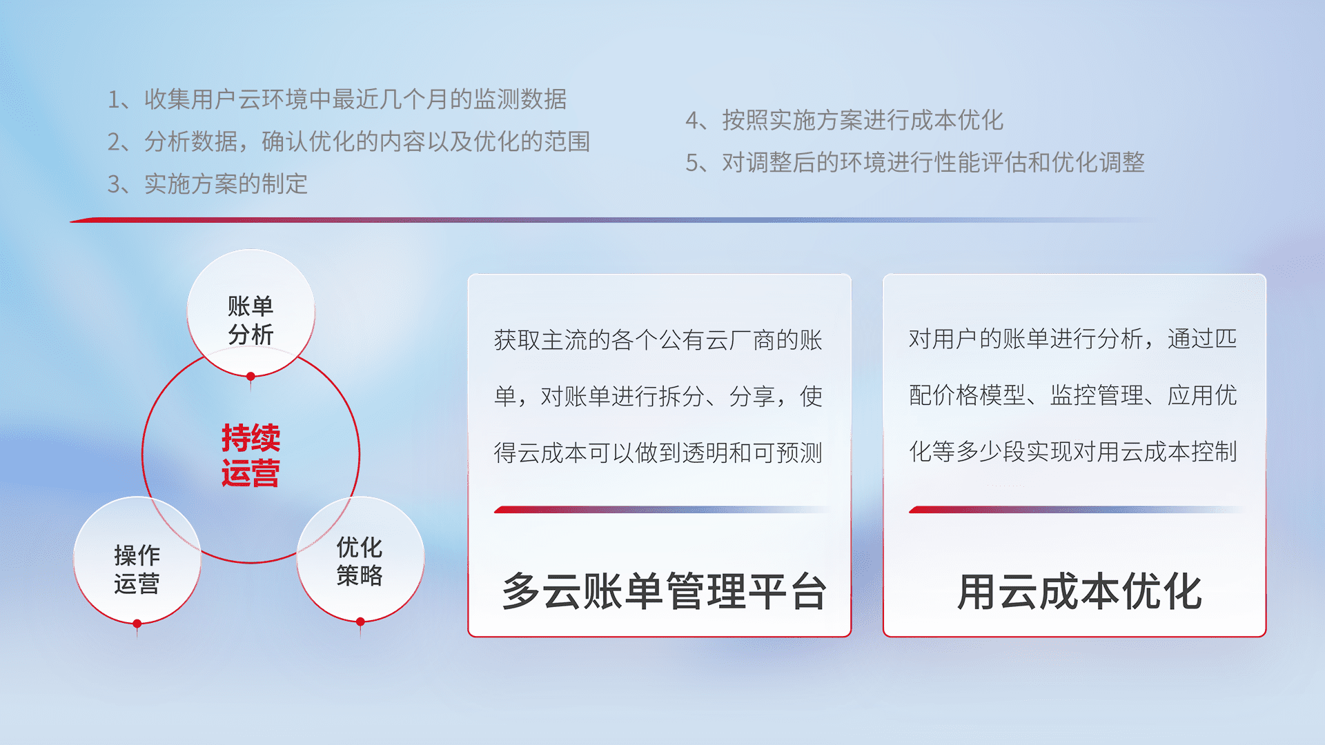 通过多云纳管,,,以统一的资源数据模型把客户的云资源进行抽象和封装,,,,进而实现对多云资源的统一操作,,保障云资源管理的可靠性、、、稳定性与可用性。。。。量身定制化运维内容,,,,配置、、、、开发运维、、、、补丁管理、、、备份、、监控、、、、认证和访问管理、、、、审计和日常巡检等,,,,保障在用云过程中的可靠度,,,稳定度以及高可用率。。。